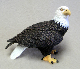 Made of solid plastic by Safari, Ltd., one of the best names in plastic toy animals, this american bald eagle measures 3 1/4 inches from beak to tail and is 2 3/8 inches tall. It stands balanced on its feet and tail. The word "EAGLE" is molded on the bottom. This sturdy, durable raptor is also excellent for school projects, novelties, party favors or even as a children's toy. You can make a wonderful birds of prey shoebox diorama using this and other plastic creatures from our gift shop. Best of all, there is no mess, no feeding, and no tank or cage cleaning :) Come look through our entire collection of eagle toys and gifts.